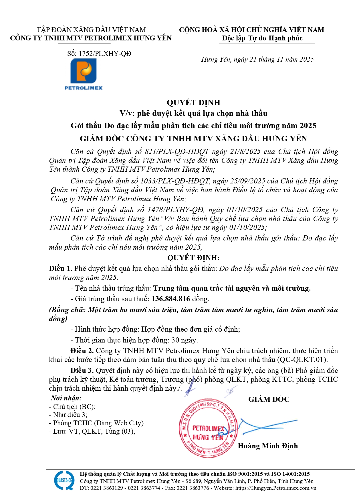 Công ty TNHH MTV Petrolimex Hưng Yên QĐ V/v Phê duyệt kết quả lựa chọn nhà thầu gói thầu Quan trắc môi trường năm 2025