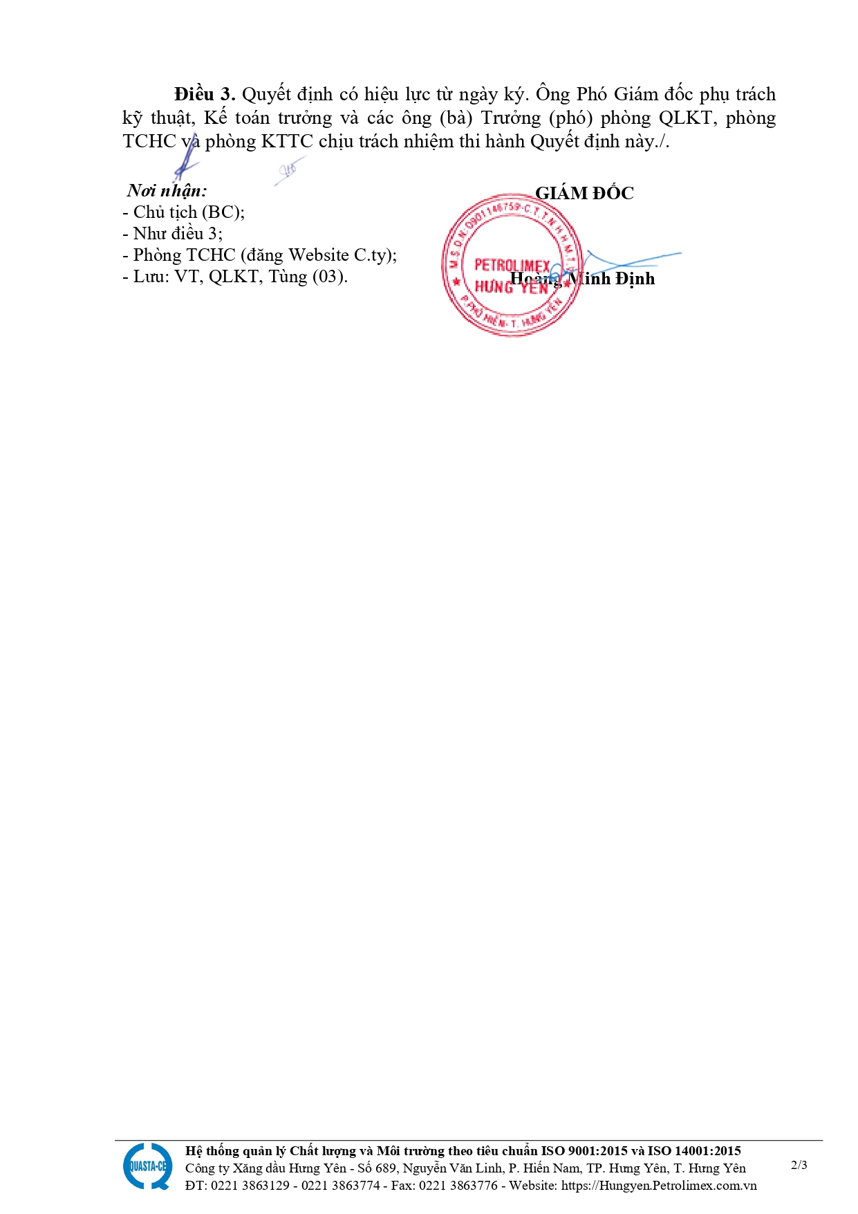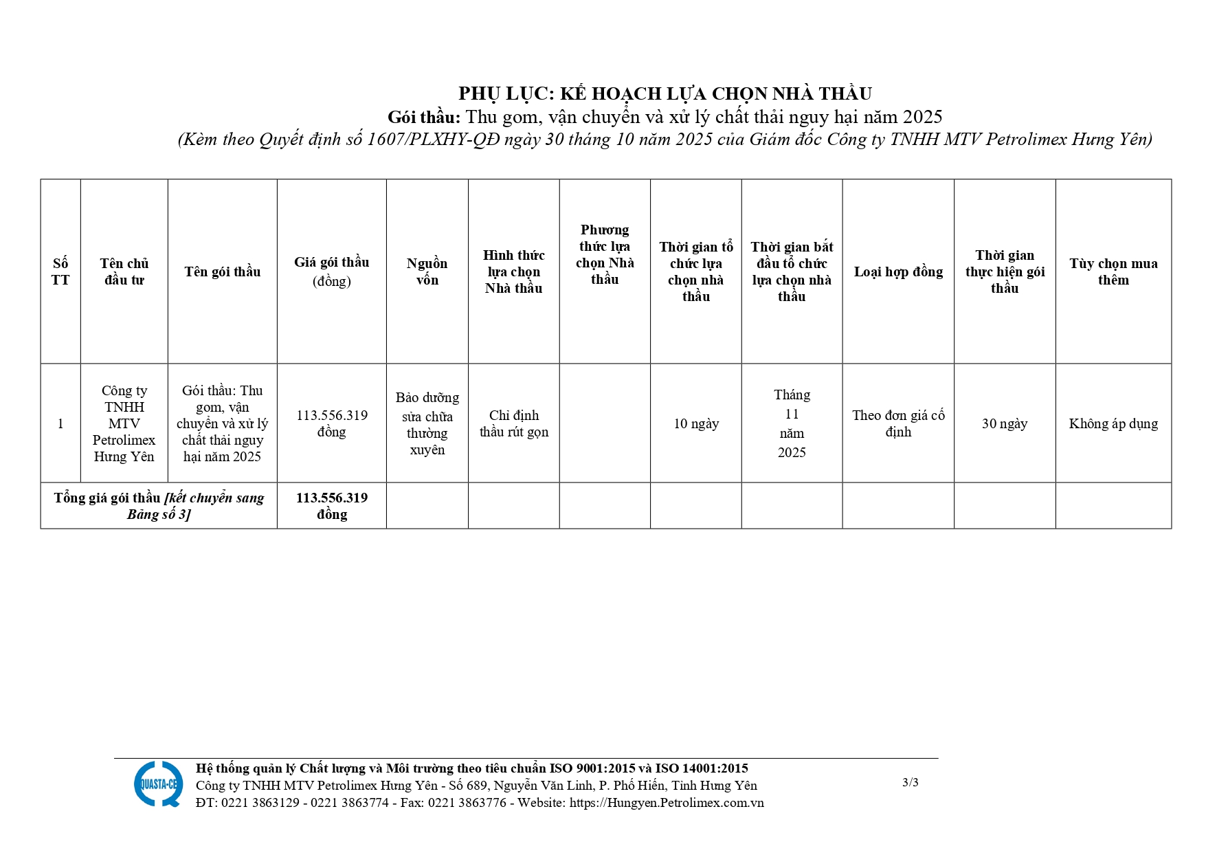 Công ty TNHH MTV Petrolimex Hưng Yên Quyết định phê duyệt kế hoạch lựa chọn nhà thầu gói thu gom vận chuyển và xử lí chất thải nguy hại năm 2025
