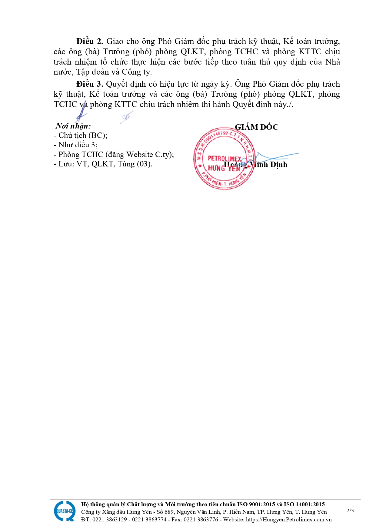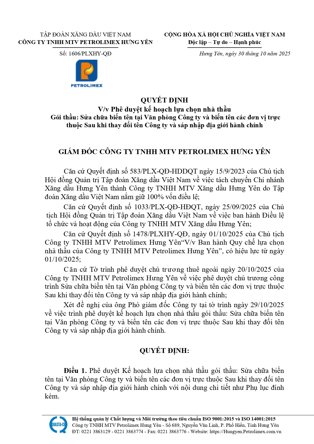 Công ty TNHH MTV Petrolimex Hưng Yên Quyết định về việc phê duyệt kế hoạch lựa chọn nhà thầu gói thầu sửa chữa biển tên tại Văn phòng Công và các đơn vị trực thuộc sau khi thay đổi tên Công ty và Sáp nhập địa giới hành chính